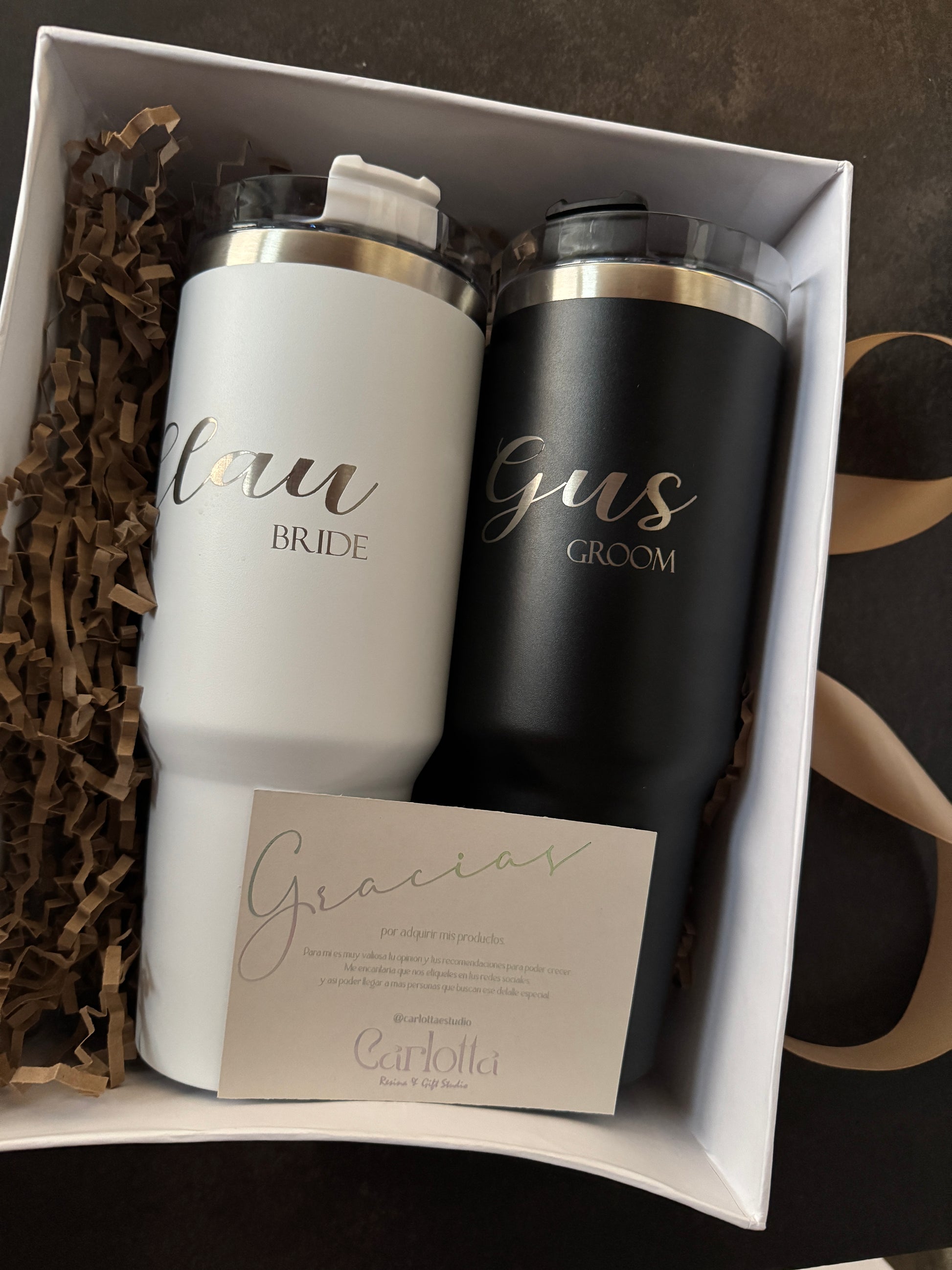 Dos termos con nombre de los Novios, en grabado laser